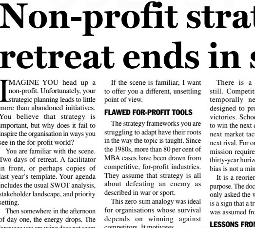 When the next retreat in your non-profit ends with a document that finally stays off the shelf, it will be because the planning process started from the right place: not how do we win, but how do we endure, and why does it matter that we do.