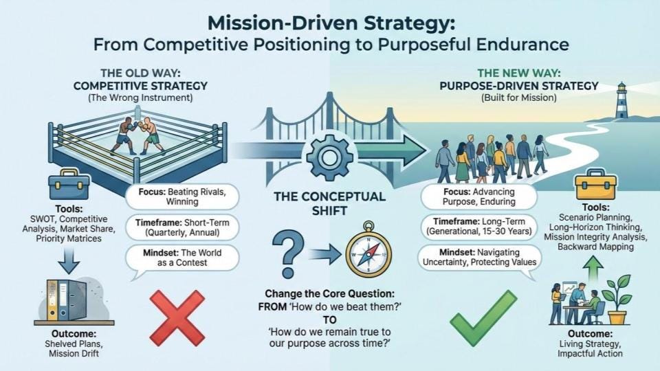 What these organisations need is not a modified version of competitive planning. They need a process that begins with a different assumption — that strategy is about protecting and advancing a purpose across time, not about positioning against opponents.